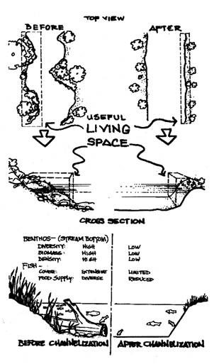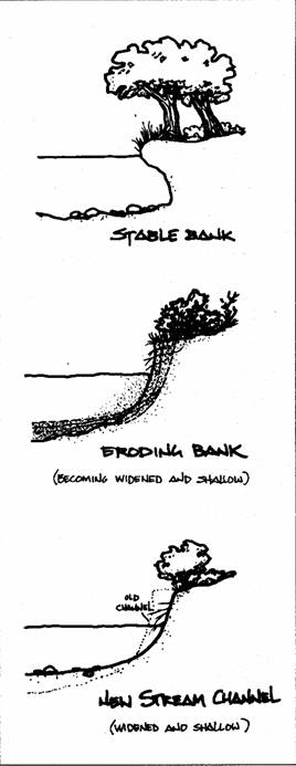 Shading affects life within the stream because many fish are sensitive to high temperatures. Shade keeps the air and water cool. The amount of shade depends on how many plants and trees are growing near the stream, the height of the trees, and the direction the stream is flowing (the direction is important because of where the sun is in relation to the trees. For example, a stream flowing in a north-south direction may have different amounts of sun than a stream flowing in an east-west direction. Trees overhanging the stream also provide nutrients (in the form of old fallen leaves) and food (insects dropping into the stream).