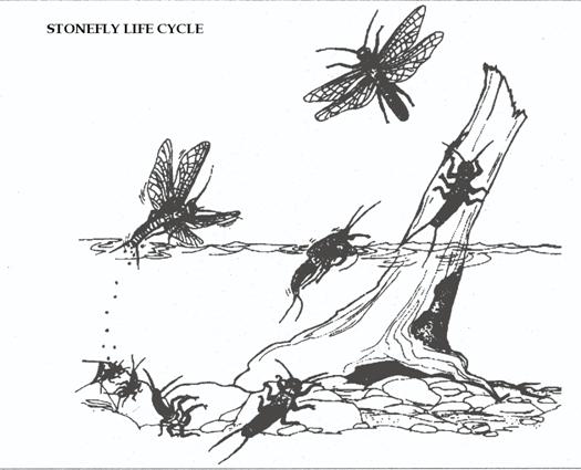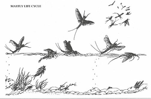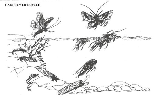 The three illustrations on the following pages show the life cycles of the caddis fly, mayfly, and the stonefly.